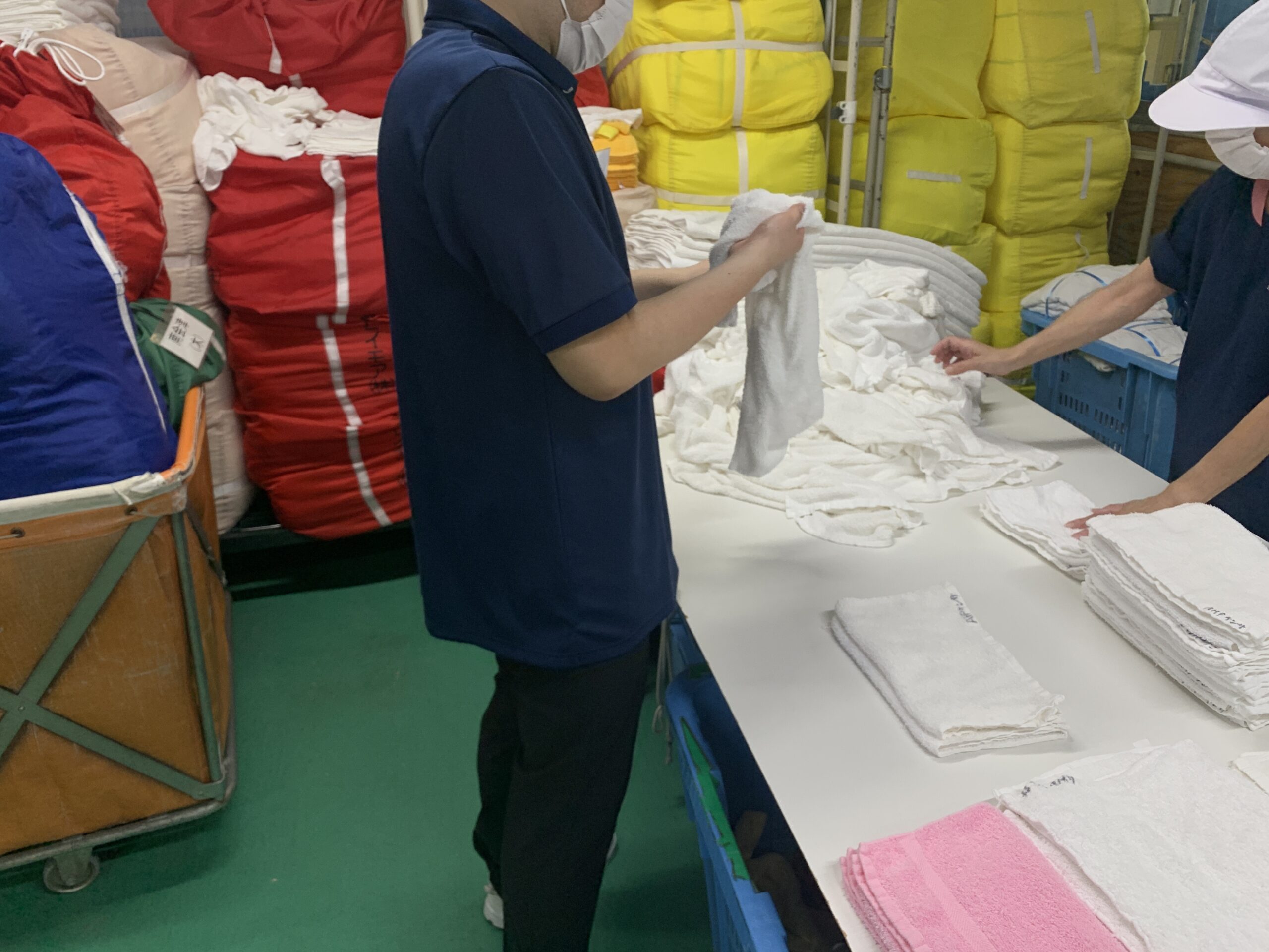 洗濯・乾燥を終えたタオルを作業台で1枚1枚丁寧にたたむ作業で、