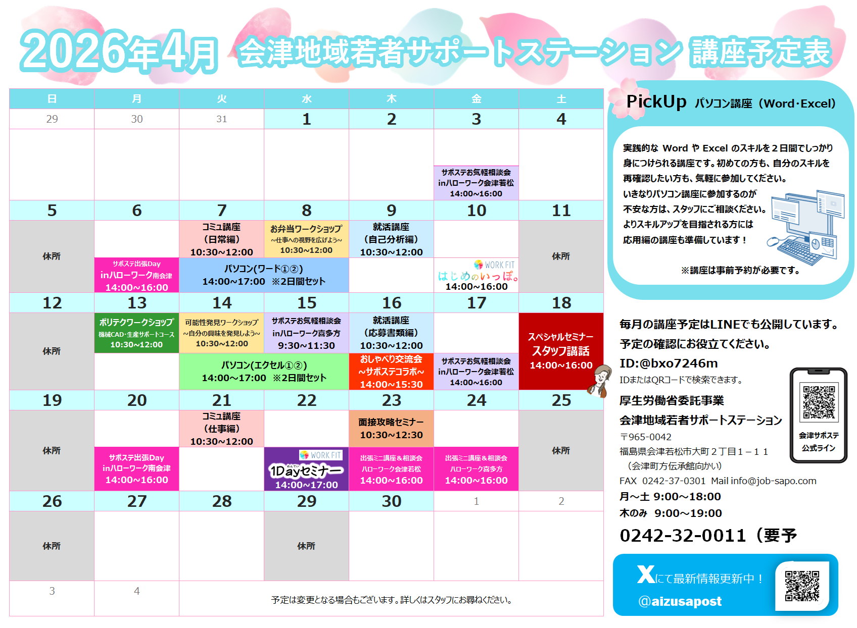 会津サポステでは、引き続き感染症対策を行いながら、相談や講座を実施いたします。