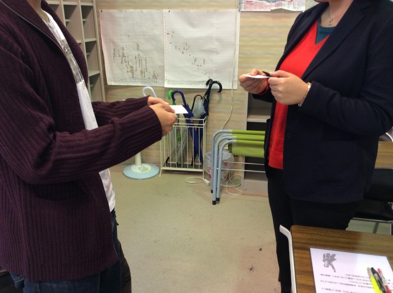 今日の講座では名刺交換(写真)をしたり、訪問、来客対応のシュミレーションを行ったりなど、グループワークを多く取り入れた内容で実施しました♪