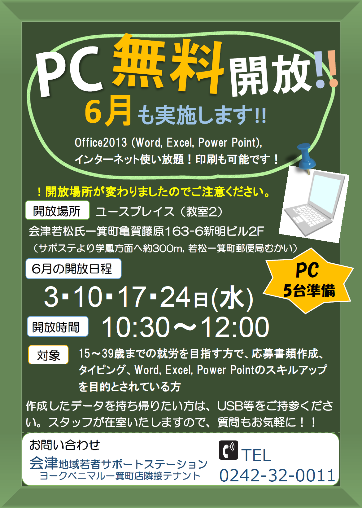 最 新のソフトを使ってパソコン講習で習ったパソコンの操作練習をしたい!応募書類を作りたい!サポステで自習したい!という声にお応えします♪サポステのパ ソコンを自由に使える開放日が決まりました。設置してあるパソコンの台数には限りがありますので、使用したい方は下記の日時をご確認の上、会津サポステに ご連絡下さい♪